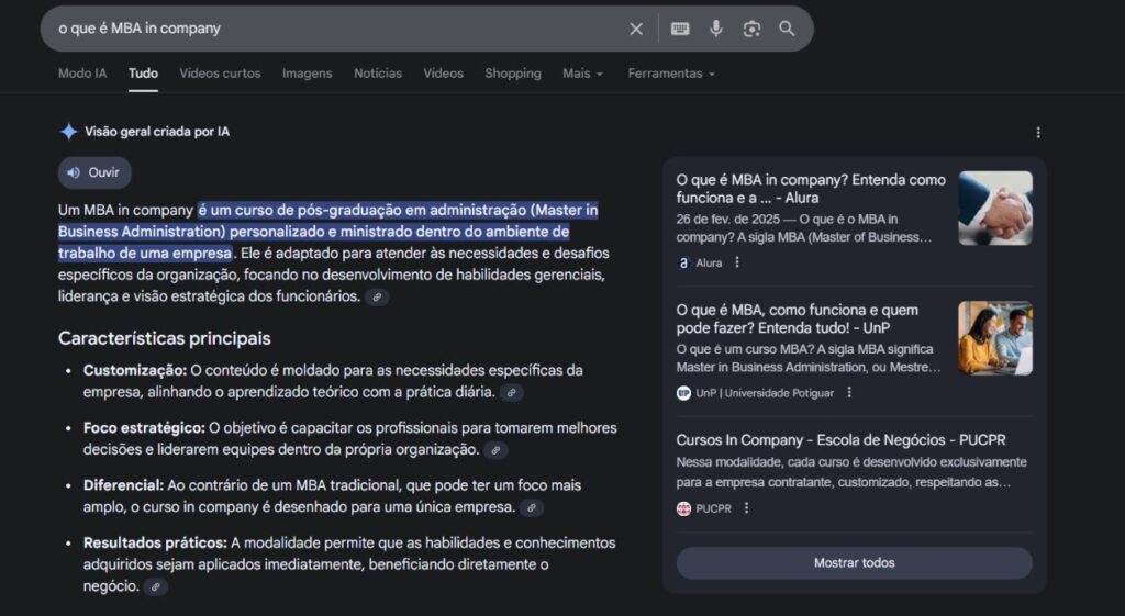 Figura 2: Print da tela de buscas do site da Google, com o termo “O que é MBA in Company” sendo pesquisado na aba do Modo AI.